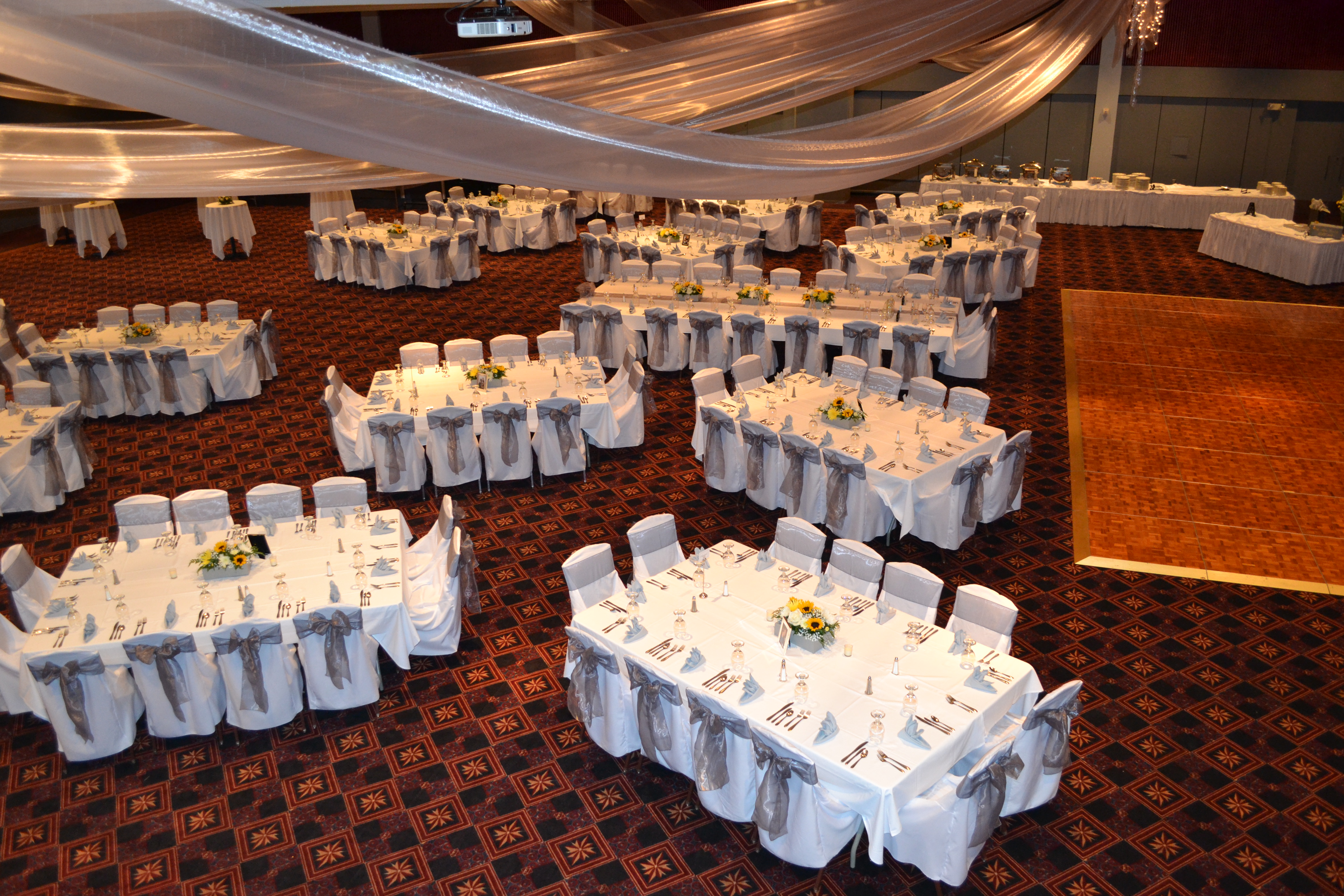 Please note: If you have additional tables set up in the room for serving food, gift tables, check-in tables, etc., it will reduce the overall seating listed here.