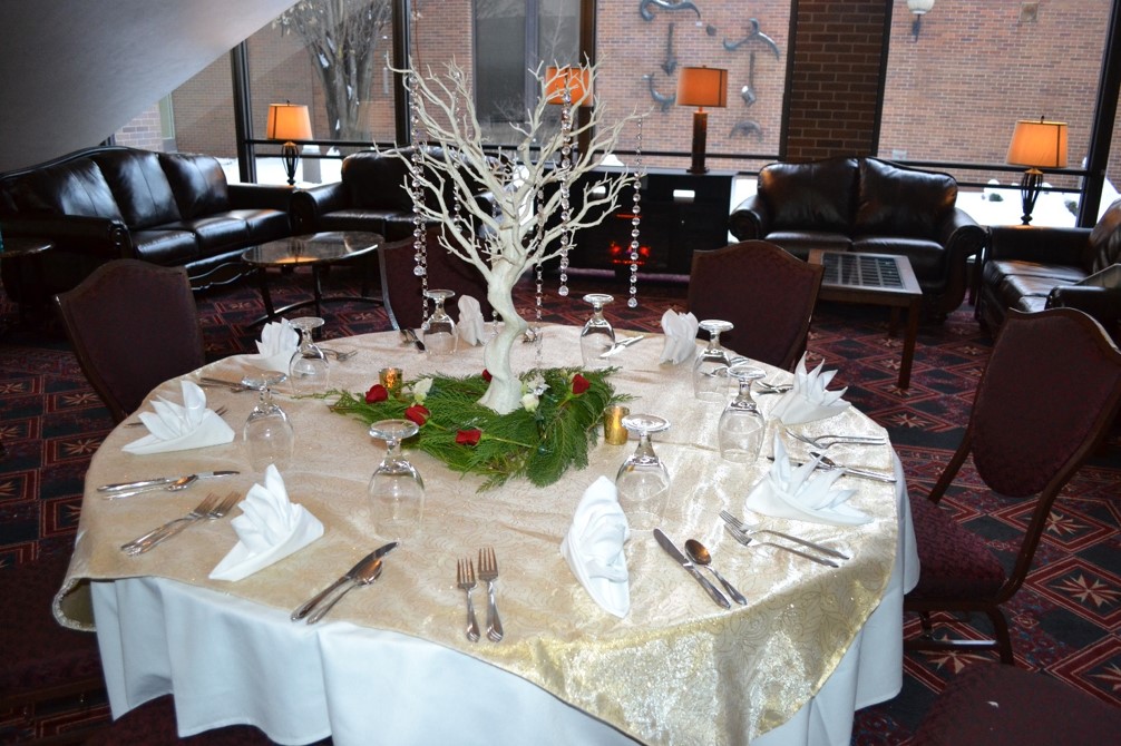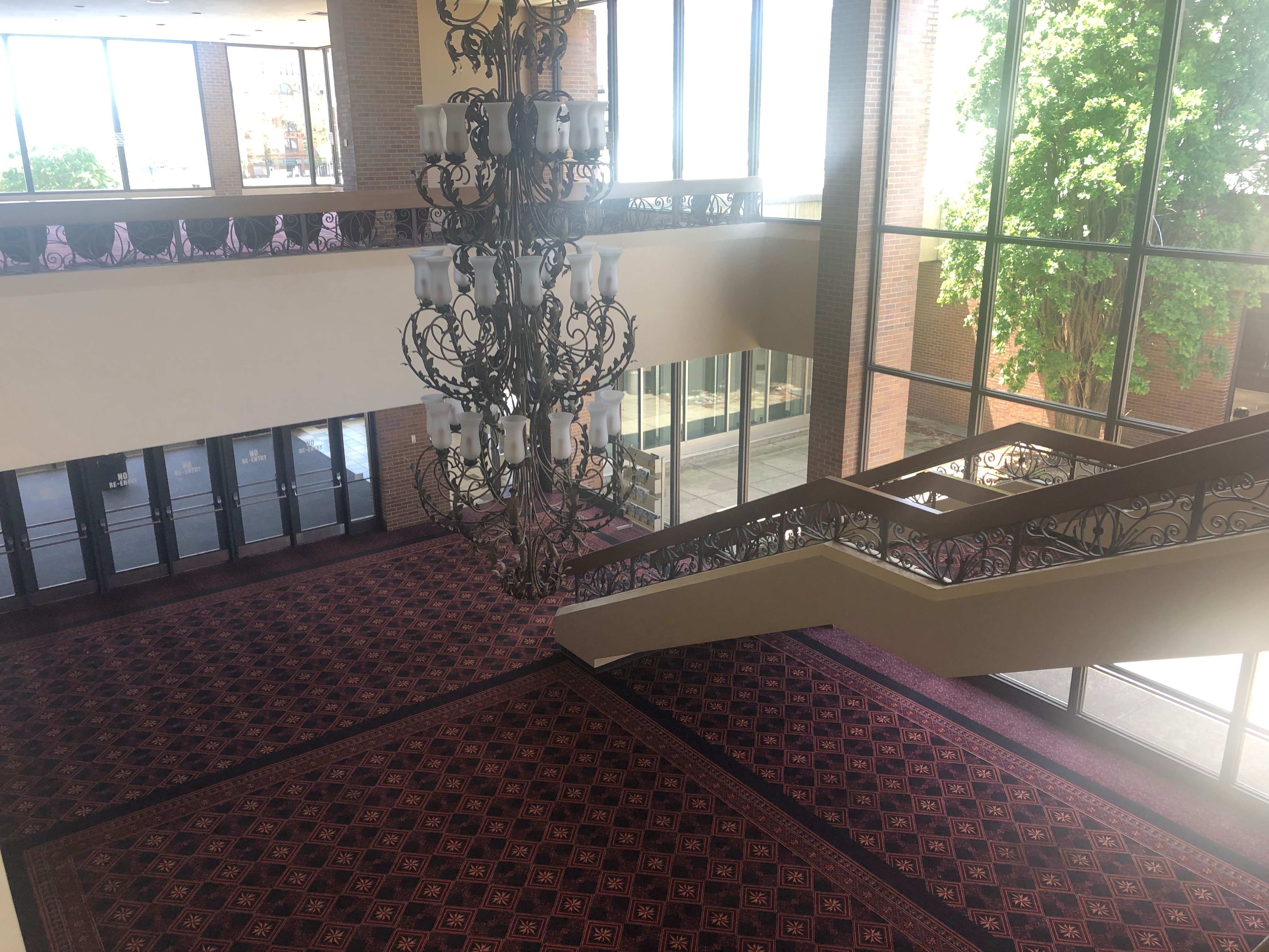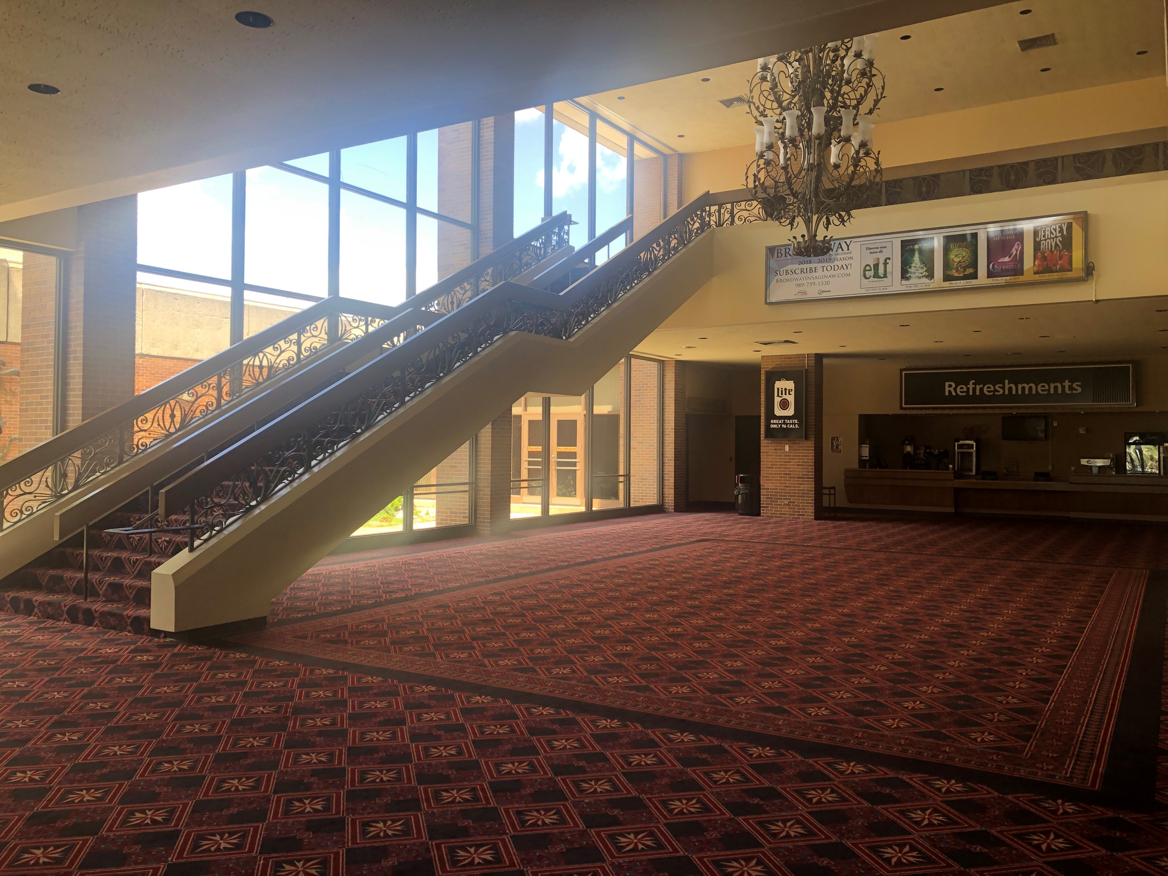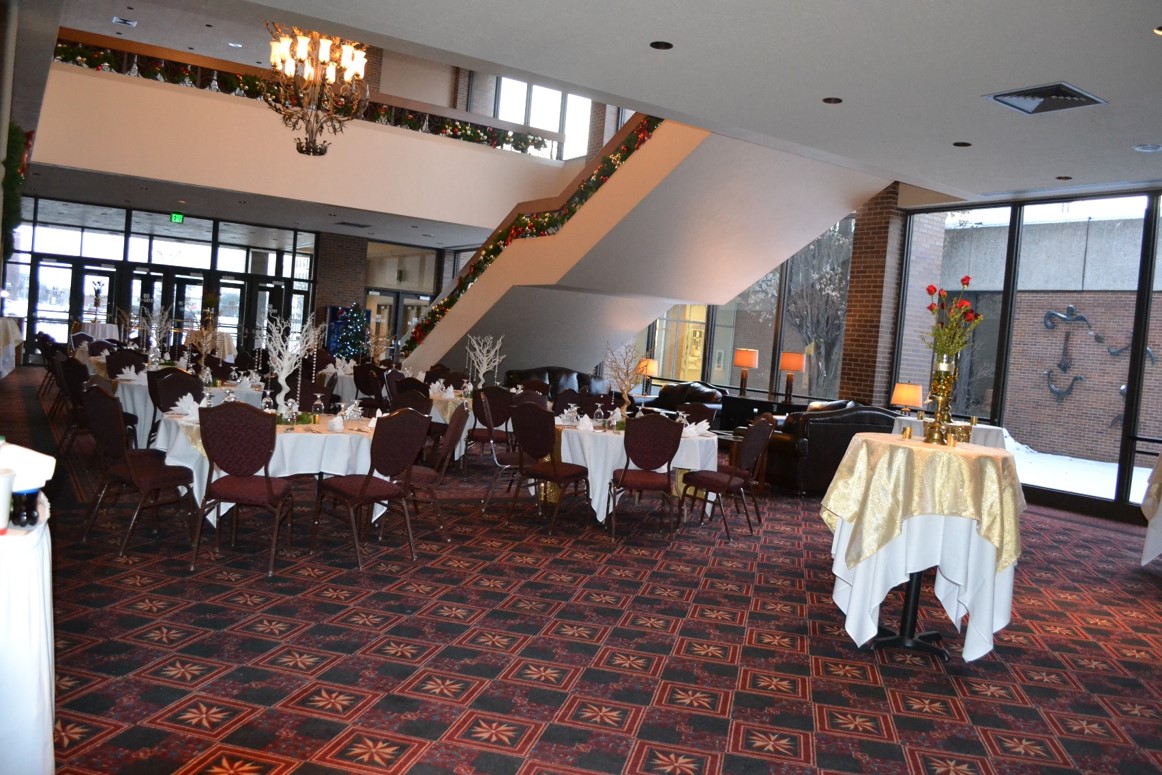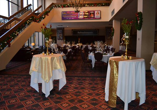 The lobby of The Theater At The Dow Event Center can also be transformed to host private events such as dinner parties and wedding receptions for up to 100 people in a banquet set-up. The lobby of The Theater At The Dow Event Center features a large staircase, a king chandelier and a large glass wall to allow plenty of daylight to shine on your event.